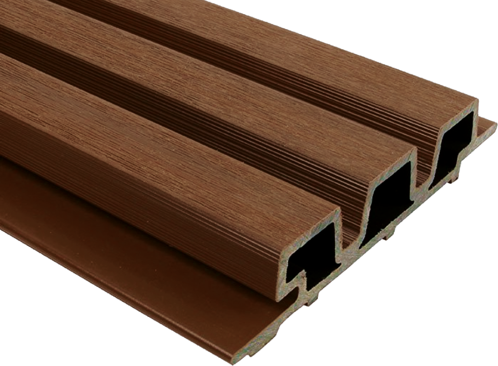 De plank heeft een natuurlijke houtuitstraling door de kleur en nagebootste houtstructuur. Het trapezevormige profiel geeft het geheel een moderne en strakke uitstraling.