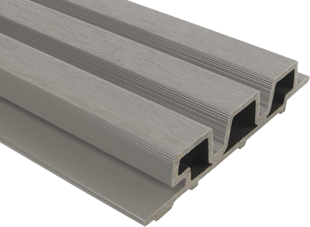 De plank heeft een natuurlijke houtuitstraling door de kleur en nagebootste houtstructuur. Het trapezevormige profiel geeft het geheel een moderne en strakke uitstraling.
