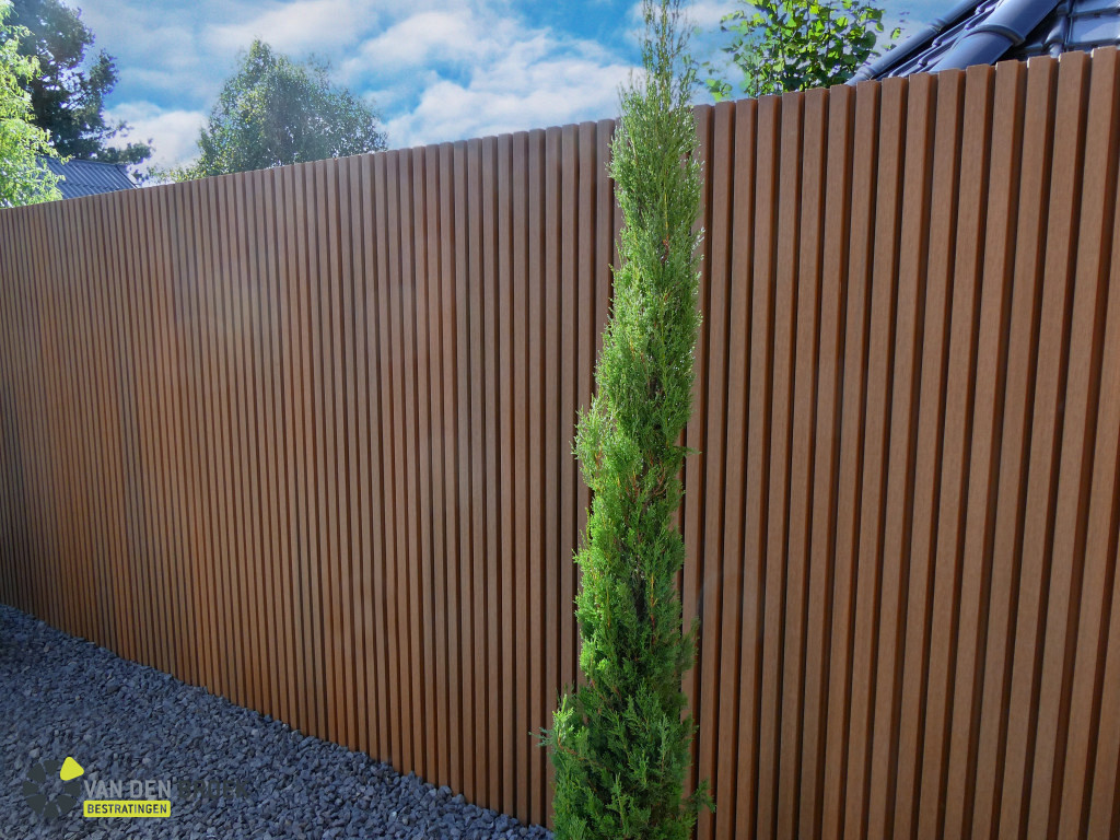 De plank heeft een natuurlijke houtuitstraling door de kleur en nagebootste houtstructuur. Het trapezevormige profiel geeft het geheel een moderne en strakke uitstraling.