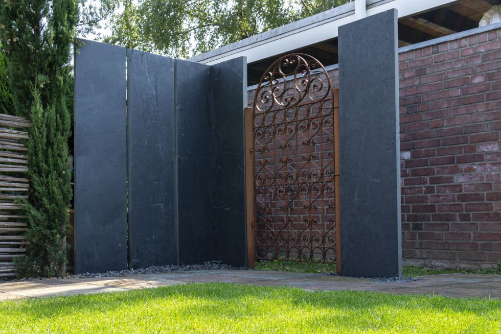 gekloofd, zijdes gezaagd, natuursteen muurelement van leisteen
