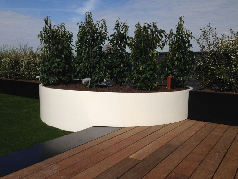 - Zeer geschikt om grote planten of bomen in te zetten. Deze kunnen door de bodemloze plantenbak doorwortelen in de tuin.