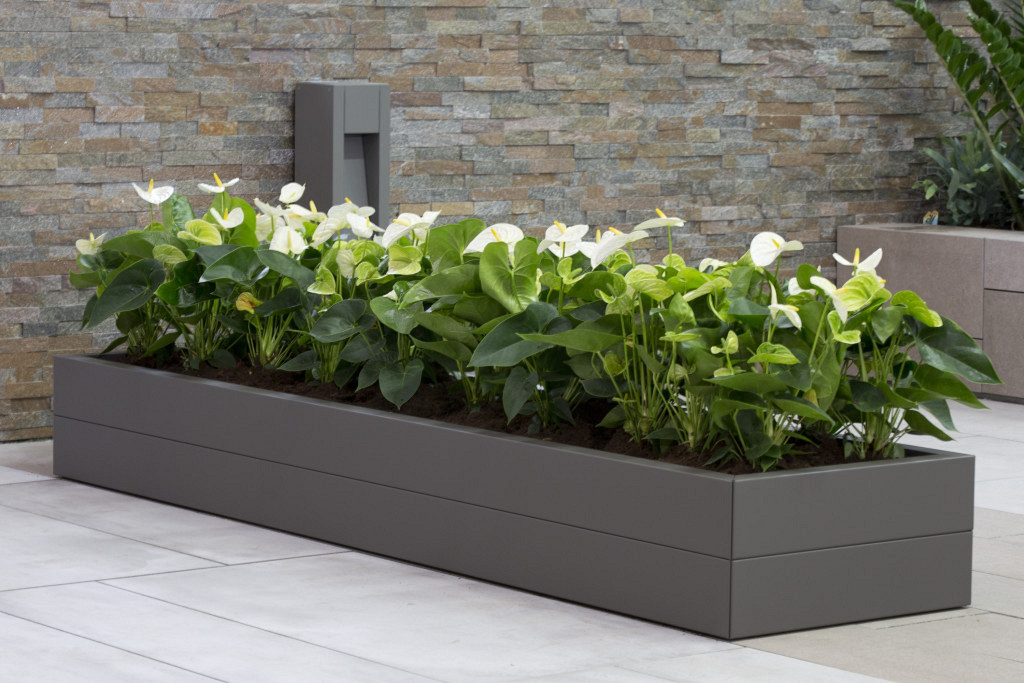 De taupekleurige modulaire plantenbak van gepoedercoat staal straalt rust, zachtheid en verfijning uit. De natuurlijke tint vormt de perfecte balans tussen grijs en bruin en past moeiteloos in elke buitenruimte.