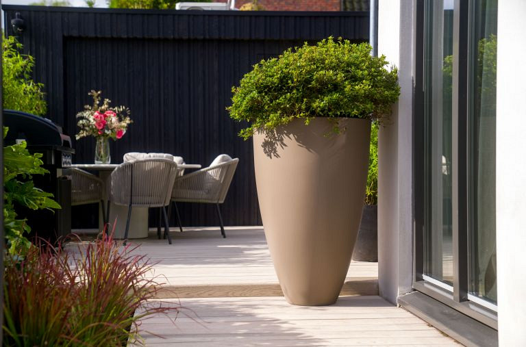 Deze vaasvormige plantenbak is uitsluitend verkrijgbaar in polyester. De CANNA valt op vanwege zijn elegante rondingen naar beneden.