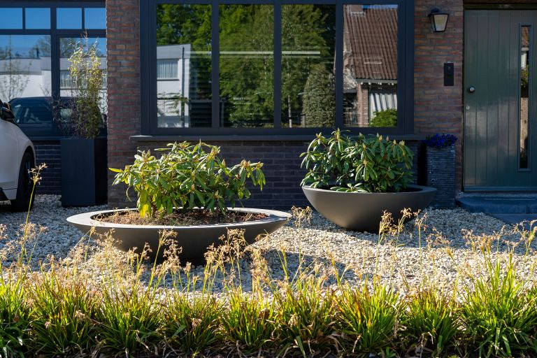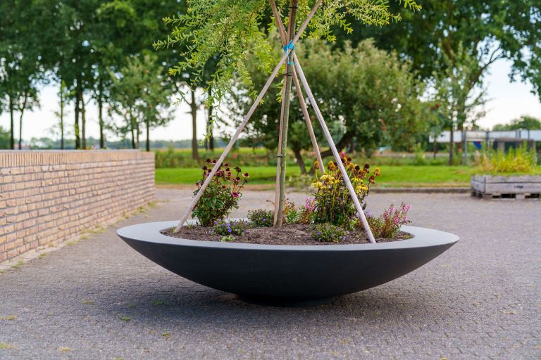 De schaalvormige CEDER past goed op een groot terras. We adviseren seizoensgebonden beplanting (viooltjes, afrikaantje e.d.) aan te brengen in deze plantenbak. Dit geeft tuinen een vriendelijk karakter.