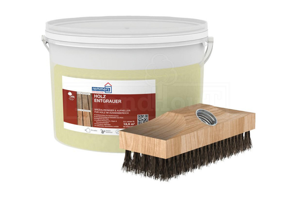 Hout-ontgrijzer verwijdert effectief vervuiling, grijze verkleuringen, roestsporen, algen en mos op houten meubelen, terrassen en andere ondergronden.