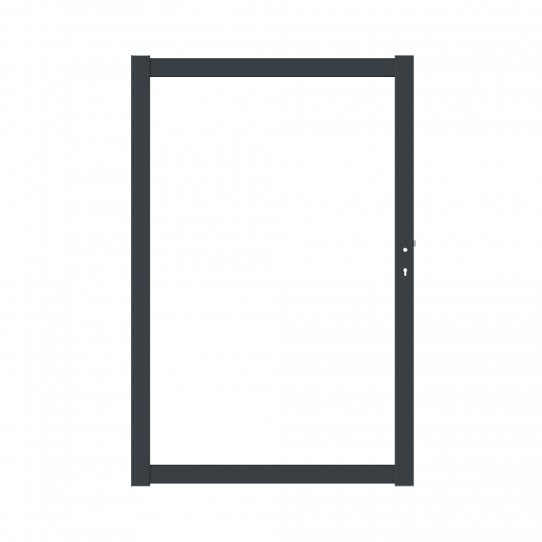 Het vulbare poortframe wordt compleet gemaakt met aluminium of WPC planken. De horizontale elementen van het frame kunnen worden afgezaagd om de breedte van de deur aan te passen. De maximale breedte is 1200 mm. Het wordt geleverd met een ingebouwd slot. De cilinder en handgrepen worden apart verkocht. Er zijn 11 planken nodig om de hoogte van het frame te vullen (wanneer niet afgezaagd). Het frame is verkrijgbaar in antraciet grijs en zwart. Ook verkrijgbaar met een breedte van 980mm.