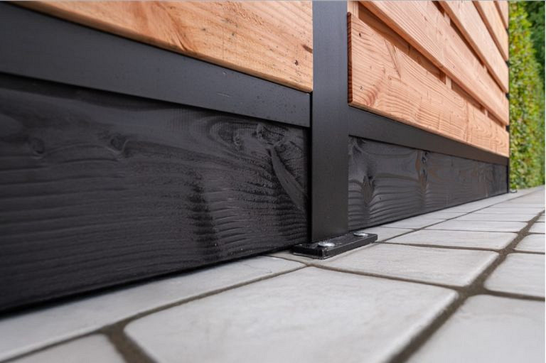 Azobe. Met veer en groef. Zwart gedompeld. Dient als onderplaat bij Hout-Metaal schuttingsysteem 2a. Duurzaamheidsklasse 1.