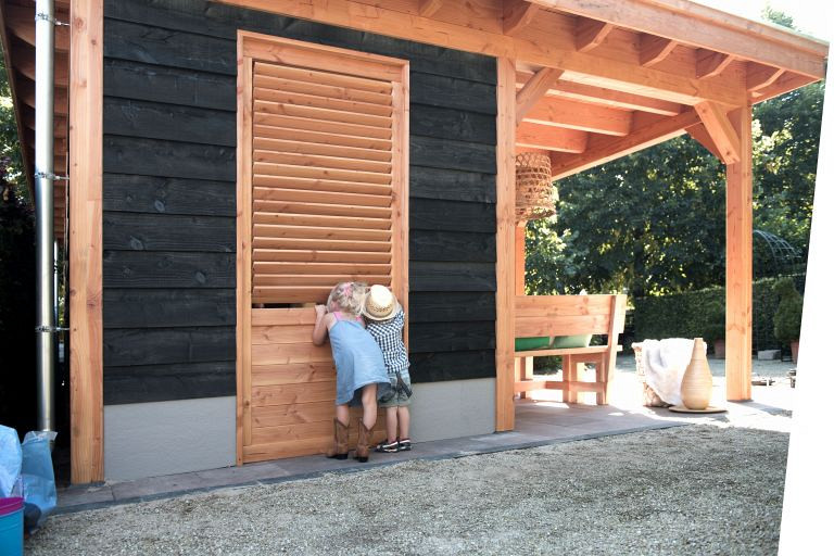 Voeg een speels element toe aan jouw tuinverblijf. Door de beweegbare douglashouten lamellen van het shutterscherm kun je spelen met de lichtinval.
