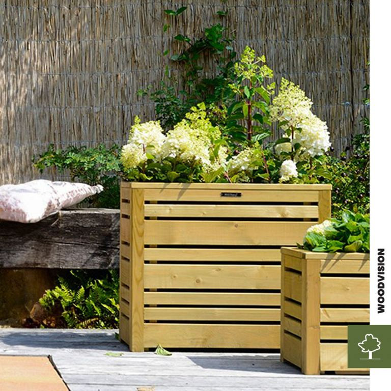 De Flux bloembakken variëren in hoogte waardoor verrassende combinaties mogelijk zijn. De toegepaste latten aan de zijkanten van deze bloembak zijn 16 mm dik en zijn verschillend van breedte, wat een speelse dynamiek met zich meebrengt. Gemaakt van vurenhout. Inclusief zwart anti-uitspoeldoek.Aanverwante artikelen