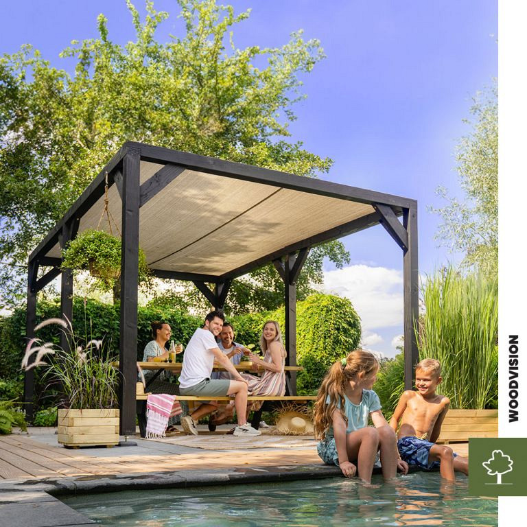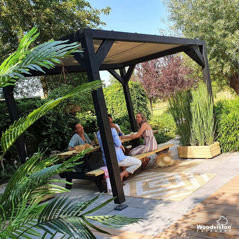 De schaduwpergola is gemaakt van vurenhout dat eerst is geïmpregneerd en vervolgens zwart gedompeld, wat zorgt voor een betere weerstand tegen houtrot en schimmels én voor een stoere uitstraling. De buitenmaat van de pergola is 300x300 cm.