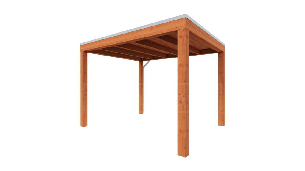 Gemaakt van onbehandeld, kunstmatig gedroogd en geschaafd Douglas-hout. Staanders van 145×145 mm, ringbalken 145×190 mm, rechte schoren, gordingbalken en dakbeschot met degelijke EPDM rubberfolie voor het plat dak. Aluminium daktrim en PVC hemelwaterafvoer inbegrepen. - Varianten & afmetingen