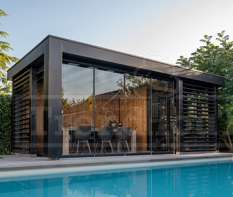 De constructie is in iedere gewenste kleur te spuiten en kan aangevuld worden met allerlei opties, zoals wanden, glazen schuifwanden en ramen en deuren.